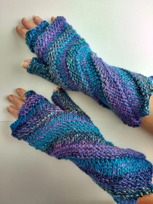 These fingerless gloves are easier to knit than they look. Using straight needles, Stocking stitch and reverse stocking stitch, it is the stitching it together at the end that creates the magic.