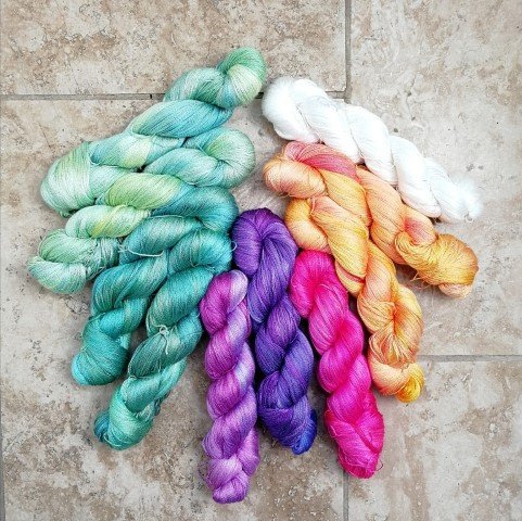 Hand dyed 4ply merino. 4 colours of this yarn is used for the Geode Shawl